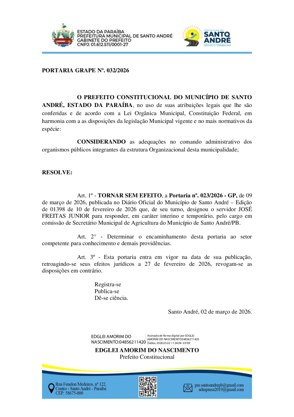 PORTARIA GRAPE Nº. 032/2026 - TORNAR SEM EFEITO, A PORTARIA Nº. 023/2026 - GP