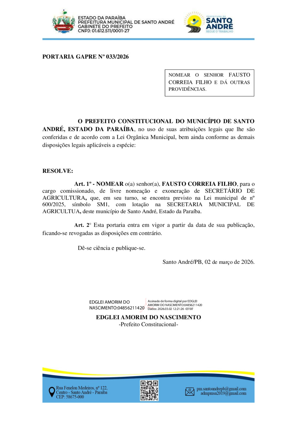PORTARIA GAPRE Nº 033/2026 - NOMEAR O SENHOR FAUSTO CORREIA FILHO E DÁ OUTRAS PROVIDÊNCIAS.