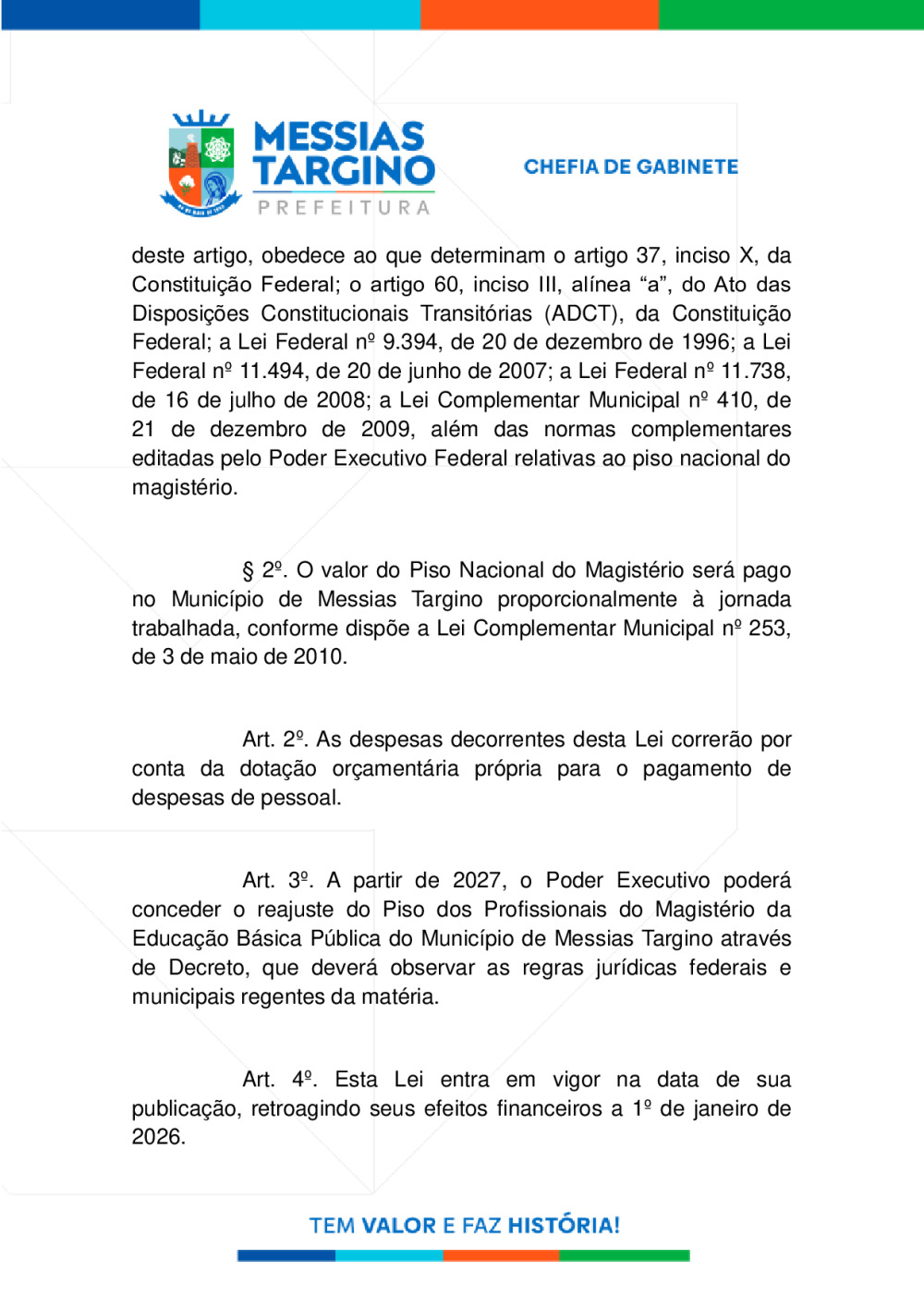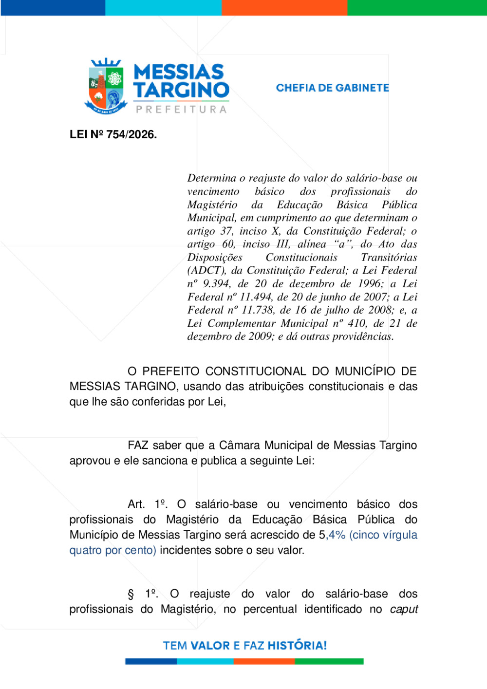 LEI Nº754 - REAJUSTE DO PISO DOS PROFISSIONAIS DO MAGISTÉRIO