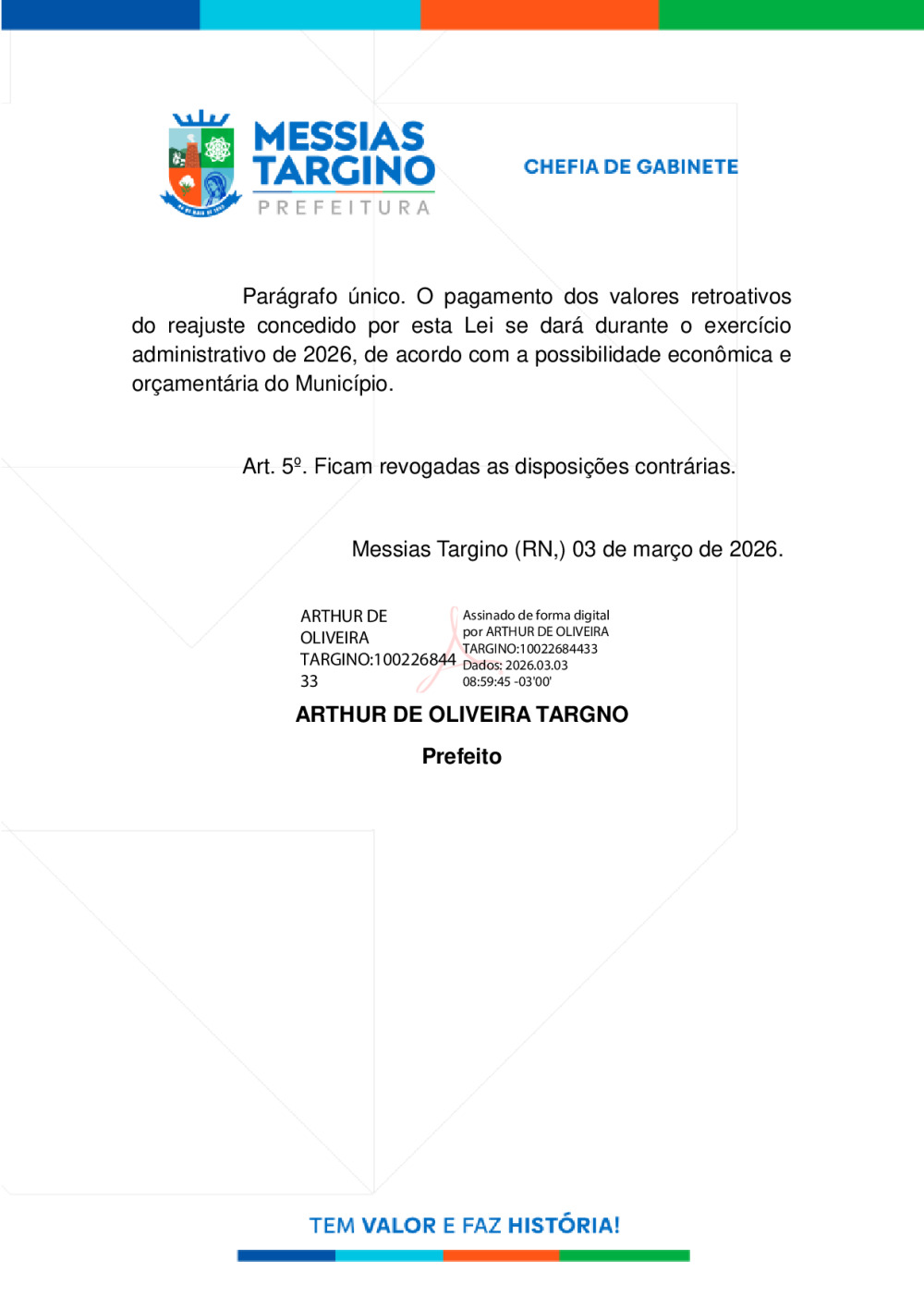 Conforme MP n° 2.200-2 de 24/08/2001, que institui a infraestrutura de chaves Públicas. Matéria Publicada no Diário Oficial do Município de Messias Targino/RN no dia - Edição 01486.
