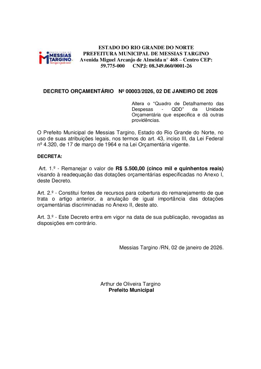 DECRETO ORÇAMENTÁRIO Nº 00003/2026