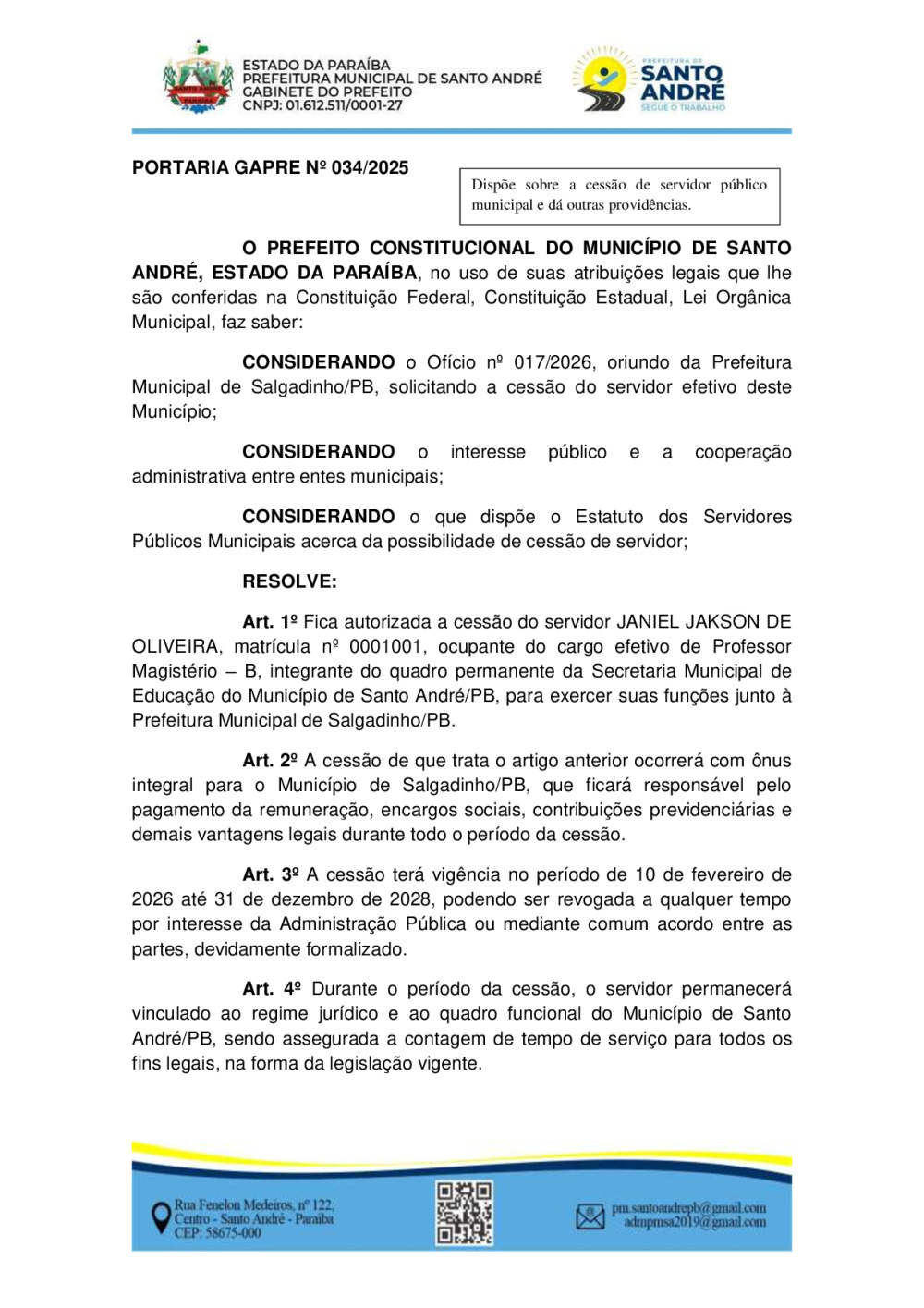 PORTARIA GAPRE Nº 034/2025 - DISPÕE SOBRE A CESSÃO DE SERVIDOR PÚBLICO MUNICIPAL E DÁ OUTRAS PROVIDÊNCIAS.