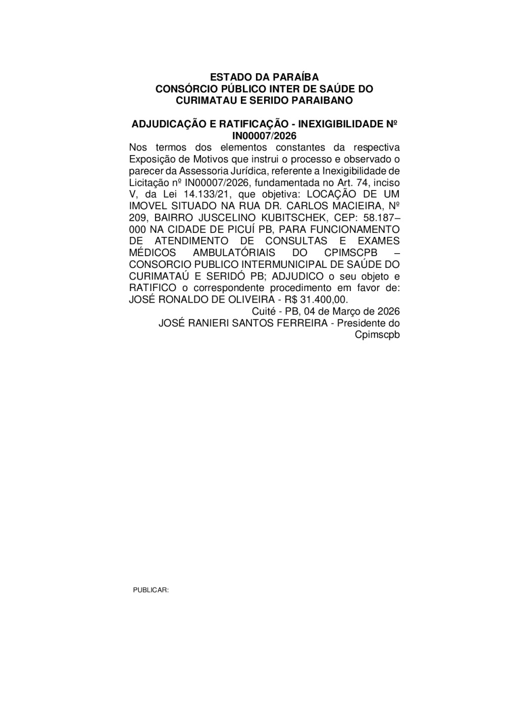 ADJUDICAÇÃO E RATIFICAÇÃO - INEXIGIBILIDADE Nº IN 0007/2026