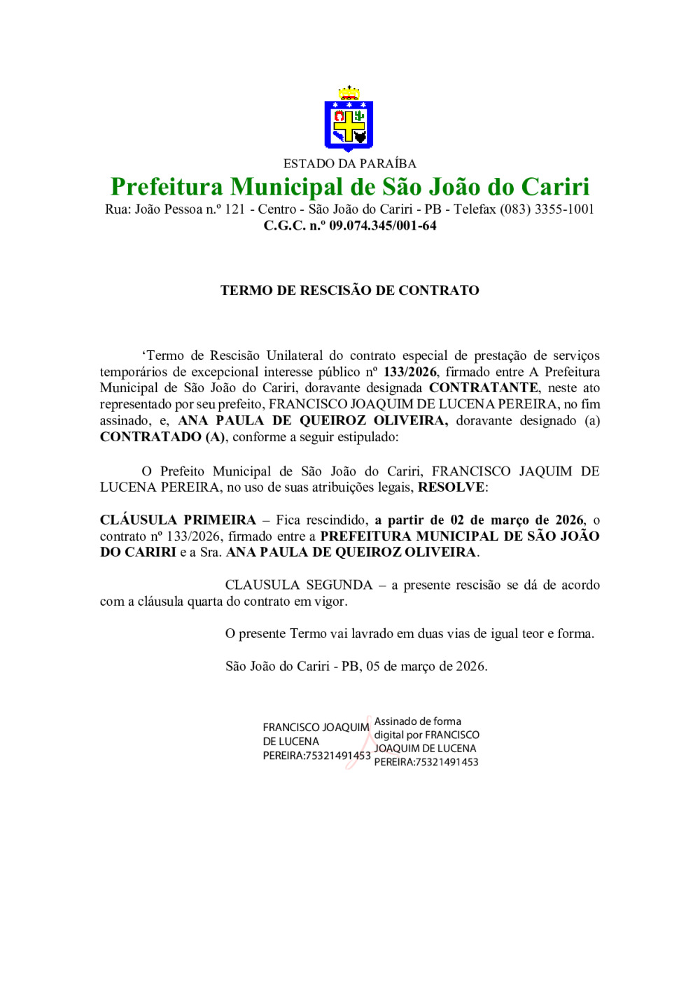 RECISÃO DE CONTRATO Nº 133/2026 - ANA PAULA DE QUEIROZ OLIVEIRA