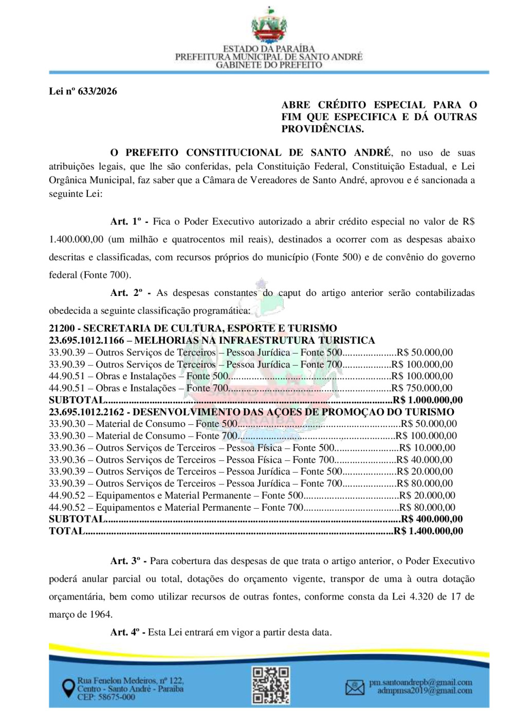 LEI Nº 633/2026 - ABRE CRÉDITO ESPECIAL PARA O FIM QUE ESPECIFICA E DÁ OUTRAS PROVIDÊNCIAS