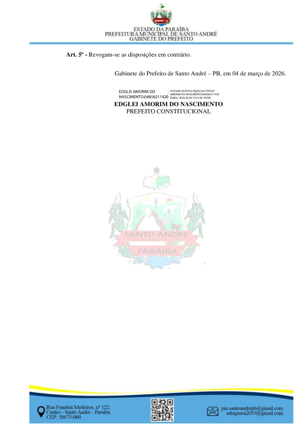 Conforme MP n° 2.200-2 de 24/08/2001, que institui a infraestrutura de chaves Públicas. Matéria Publicada no Diário Oficial do Município de Santo André/PB no dia - Edição 01413.