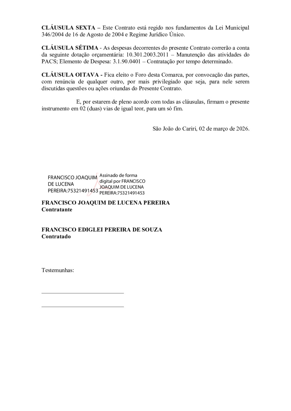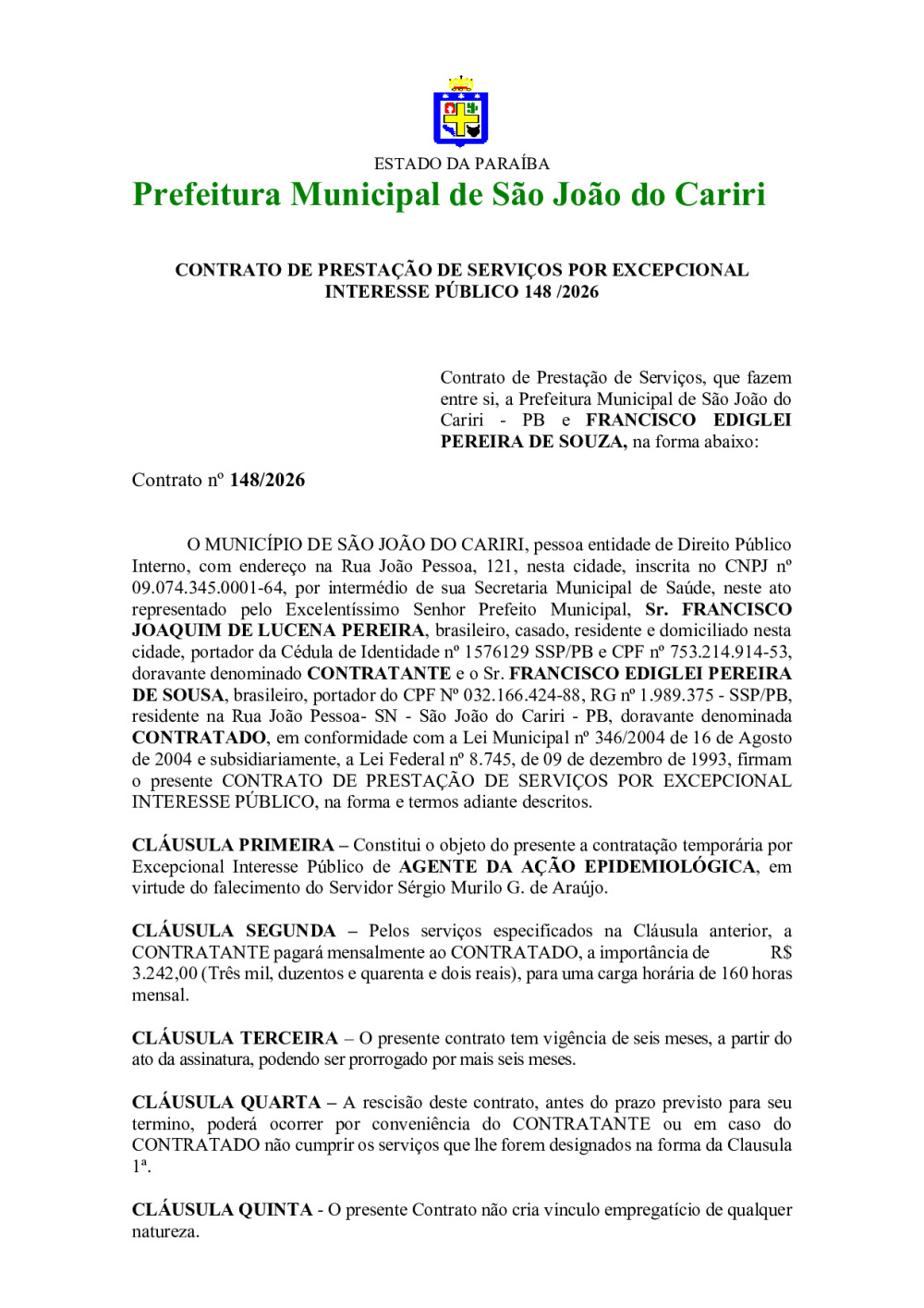 CONTRATO 148/2026 - FRANCISCO EDGLEI PEREIRA DE SOUZA