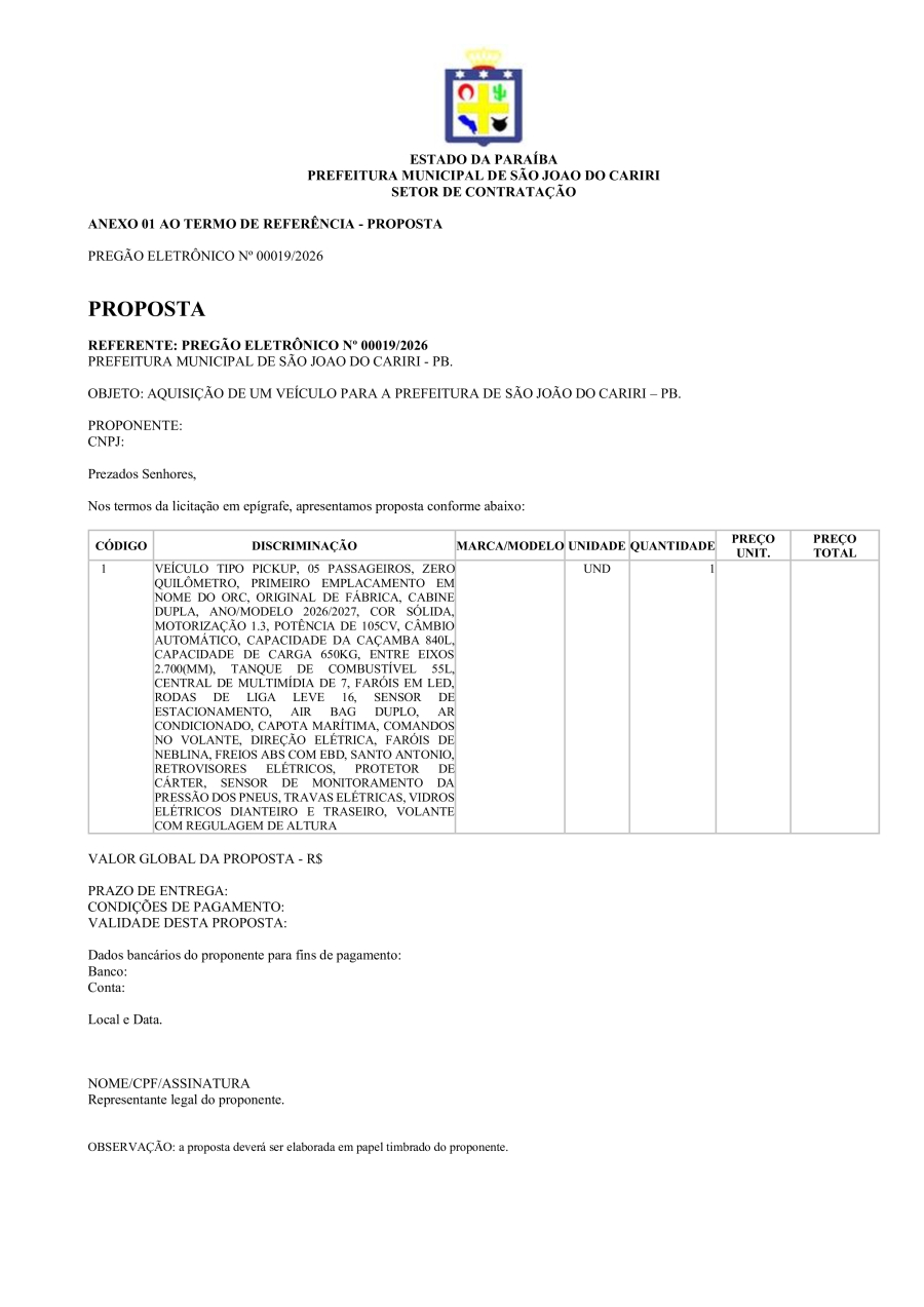 AVISO DE LICITAÇÃO - PREGÃO ELETRÔNICO Nº 00019/2026