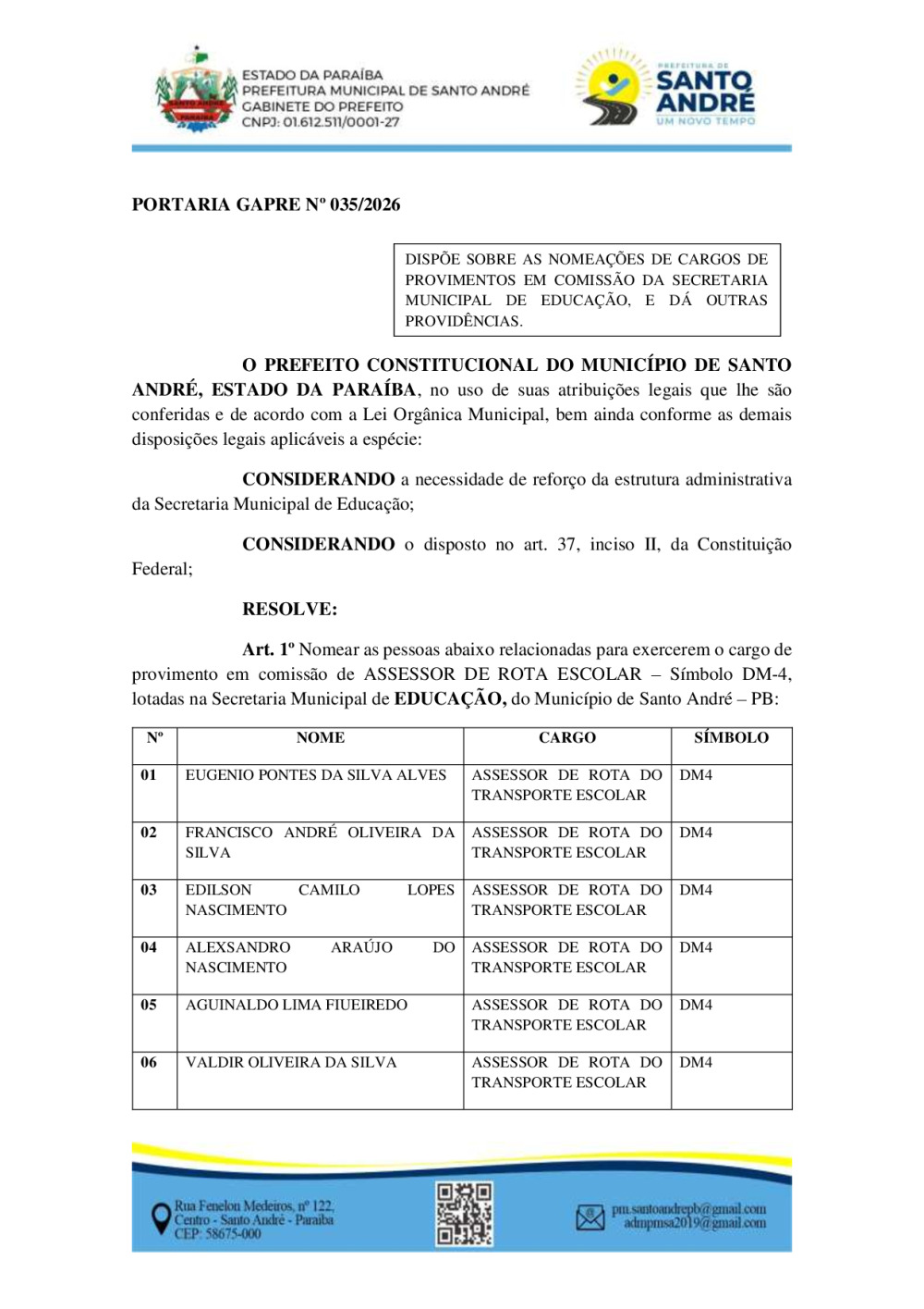 PORTARIA GAPRE Nº 035/2026 - DISPÕE SOBRE AS NOMEAÇÕES DE CARGOS DE PROVIMENTOS EM COMISSÃO DA SECRETARIA MUNICIPAL DE EDUCAÇÃO, E DÁ OUTRAS PROVIDÊNCIAS.