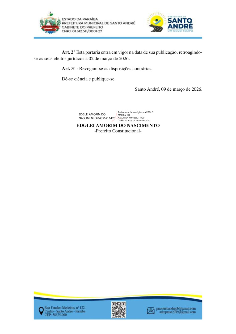 Conforme MP n° 2.200-2 de 24/08/2001, que institui a infraestrutura de chaves Públicas. Matéria Publicada no Diário Oficial do Município de Santo André/PB no dia - Edição 01415.