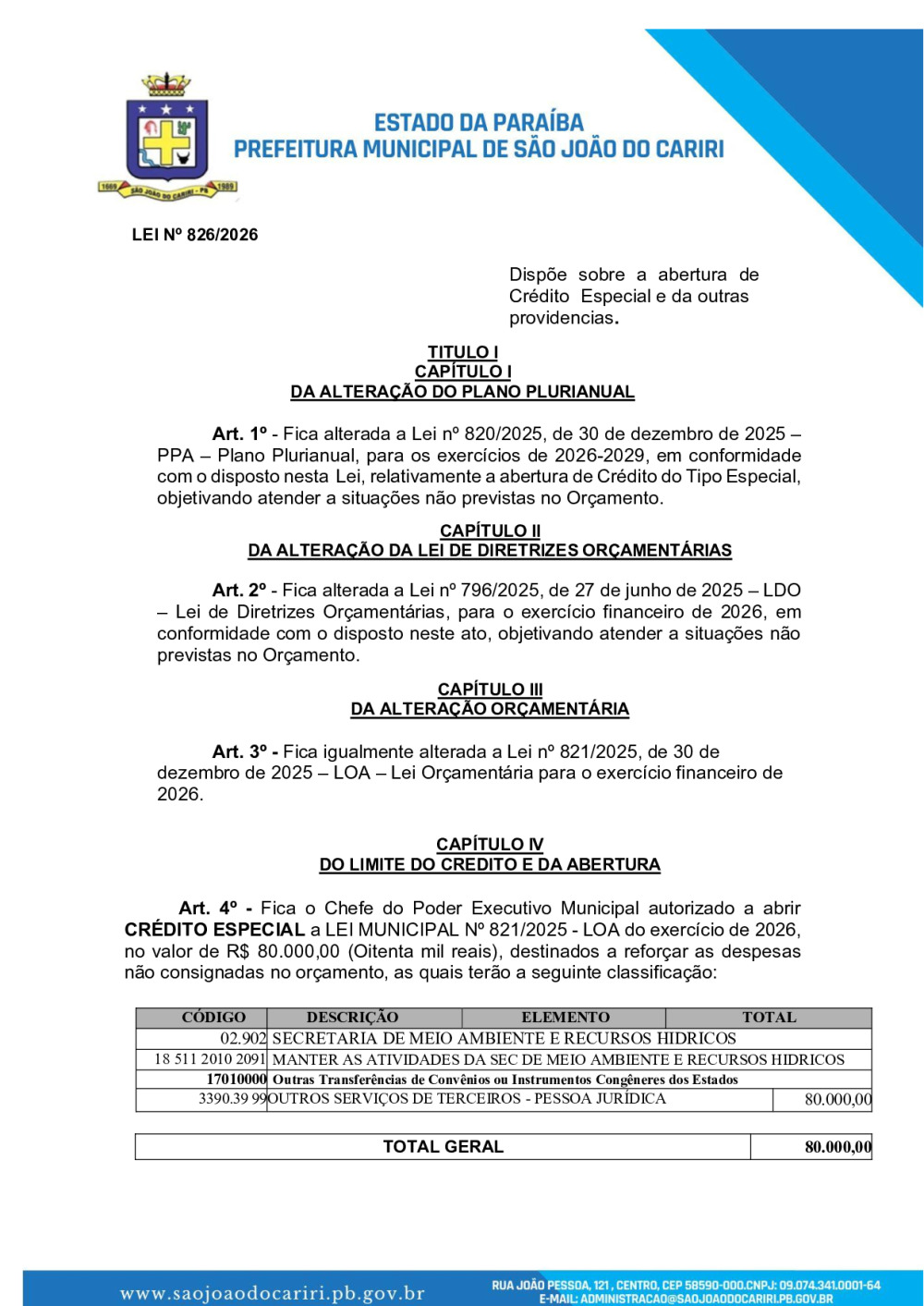 LEI 826/202 - DISPÕE SOBRE A ABERTURA DE CRÉDITO ESPECIAL E DA OUTRAS PROVIDENCIAS.