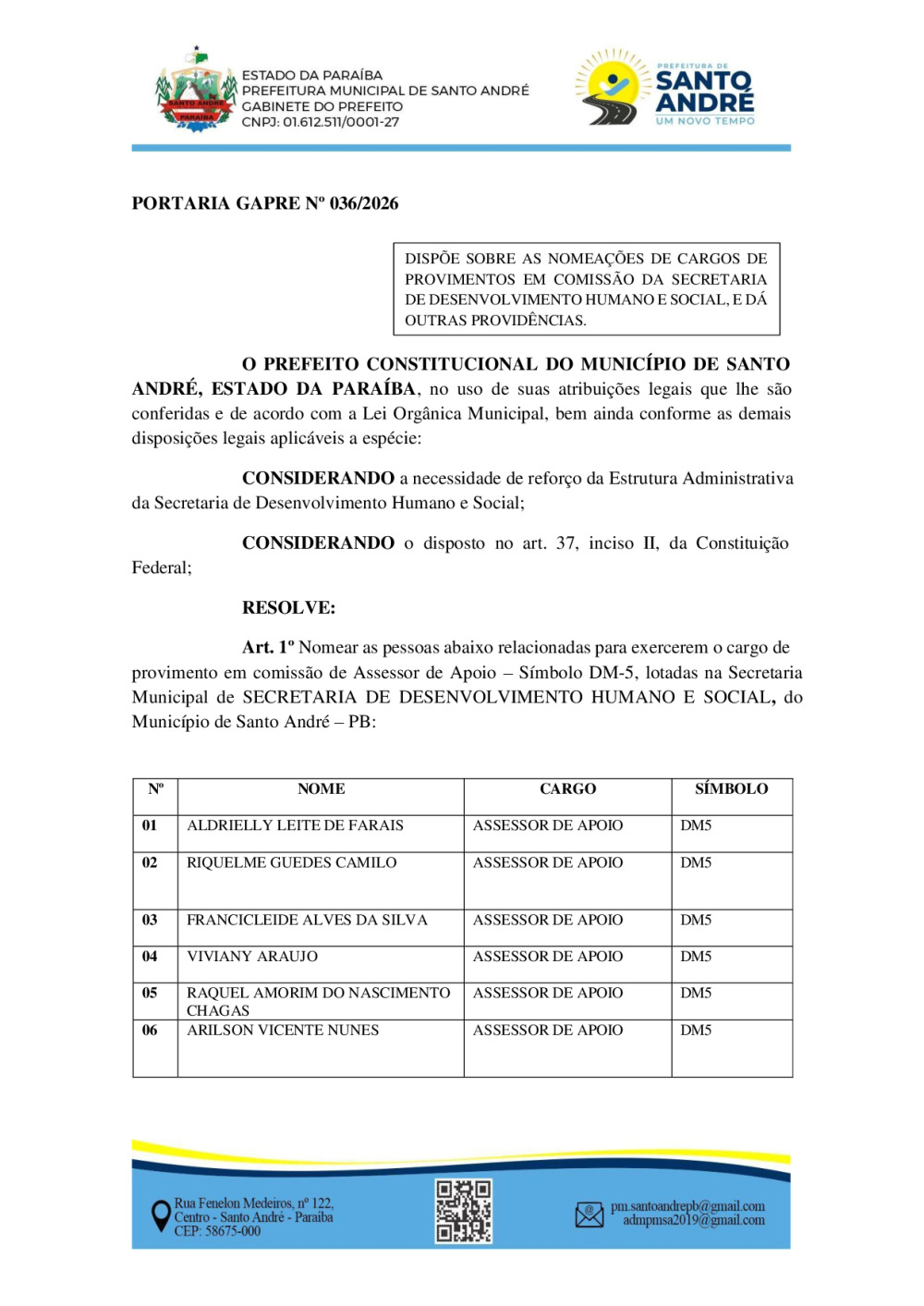 PORTARIA GAPRE Nº 036/2026 - DISPÕE SOBRE AS NOMEAÇÕES DE CARGOS DE PROVIMENTOS EM COMISSÃO DA SECRETARIA DE DESENVOLVIMENTO HUMANO E SOCIAL, E DÁ OUTRAS PROVIDÊNCIAS.