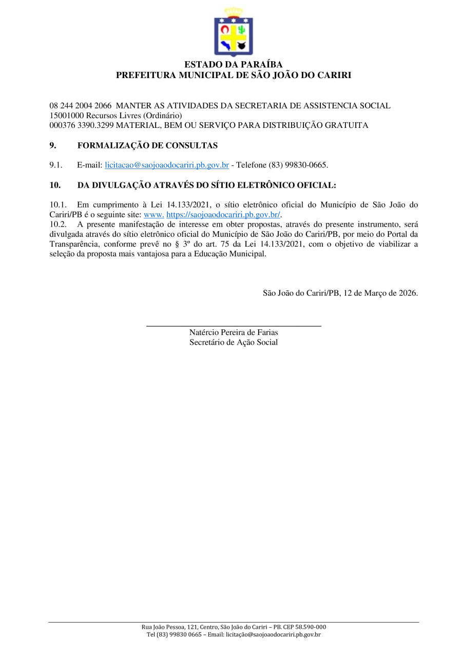 Conforme MP n° 2.200-2 de 24/08/2001, que institui a infraestrutura de chaves Públicas. Matéria Publicada no Diário Oficial do Município de São João do Cariri/PB no dia - Edição 01937.