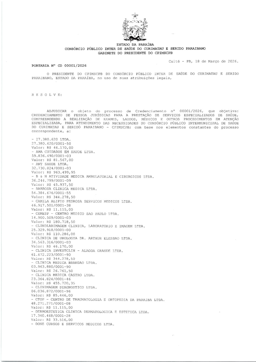 PORTARIA Nº CD 00001/2026 - ADJUDICAR O OBJETO DO PROCESSO DE CREDENCIAMENTO Nº 0001/2026