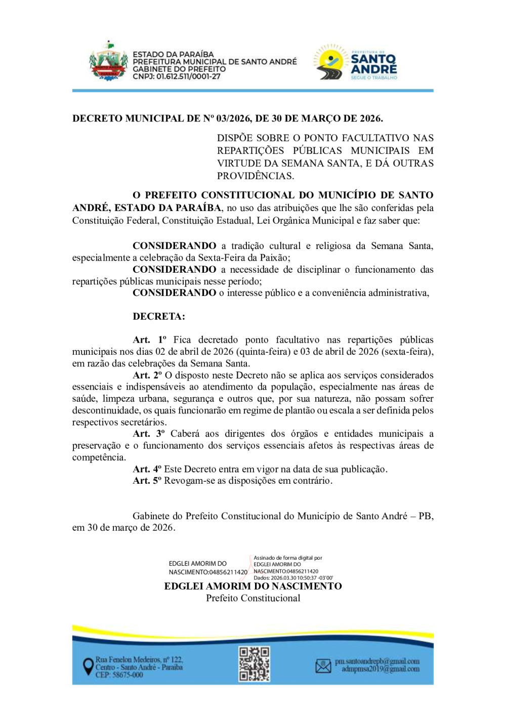 DECRETO MUNICIPAL DE Nº 03/2026, DE 30 DE MARÇO DE 2026 - DISPÕE SOBRE O PONTO FACULTATIVO NAS REPARTIÇÕES PÚBLICAS MUNICIPAIS EM VIRTUDE DA SEMANA SANTA, E DÁ OUTRAS PROVIDÊNCIAS