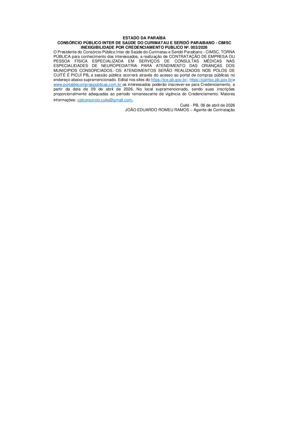 INEXIGIBILIDADE POR CREDENCIAMENTO PUBLICO Nº 003/2026