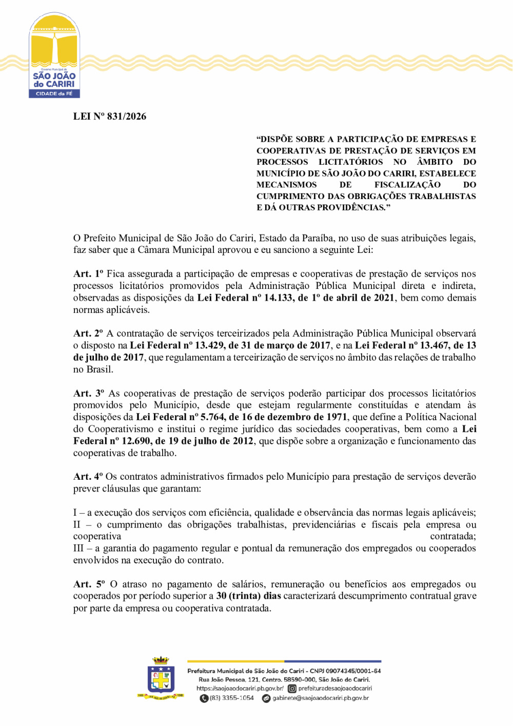 DISPÕE SOBRE A PARTICIPAÇÃO DE EMPRESAS E COOPERATIVAS DE PRESTAÇÃO DE SERVIÇOS EM PROCESSOS LICITATÓRIOS NO ÂMBITO DO MUNICÍPIO DE SÃO JOÃO DO CARIRI, ESTABELECE MECANISMOS DE FISCALIZAÇÃO DO CUMPRIMENTO DAS OBRIGAÇÕES TRABALHISTAS E DÁ OUTRAS PROVIDÊNCIAS