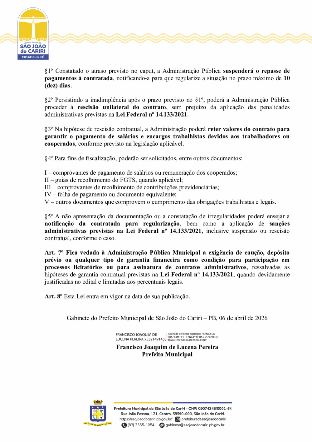 Conforme MP n° 2.200-2 de 24/08/2001, que institui a infraestrutura de chaves Públicas. Matéria Publicada no Diário Oficial do Município de São João do Cariri/PB no dia - Edição .