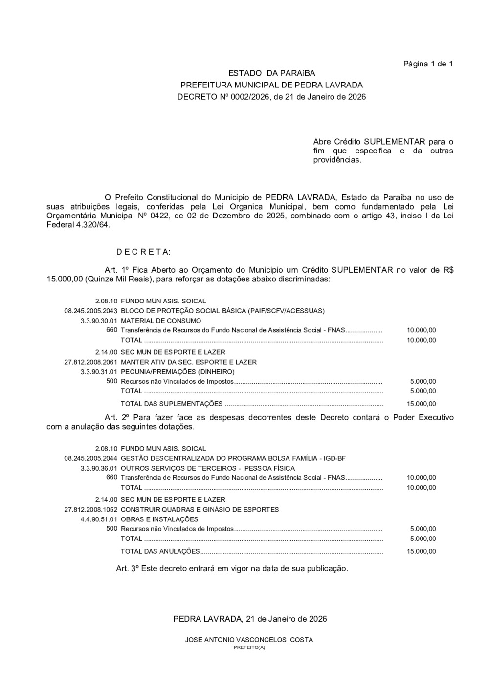 DECRETO Nº 0002/2026 - ABRE CRÉDITO SUPLEMENTAR PARA O FIM QUE ESPECIFICA