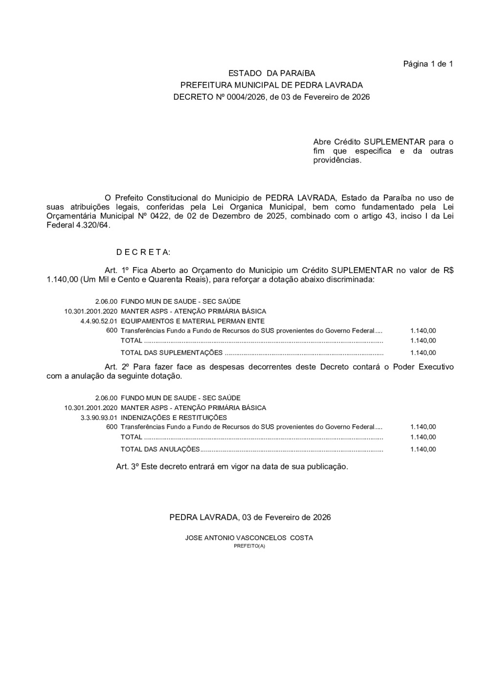 DECRETO Nº 0004/2026 - ABRE CRÉDITO SUPLEMENTAR PARA O FIM QUE ESPECIFICA