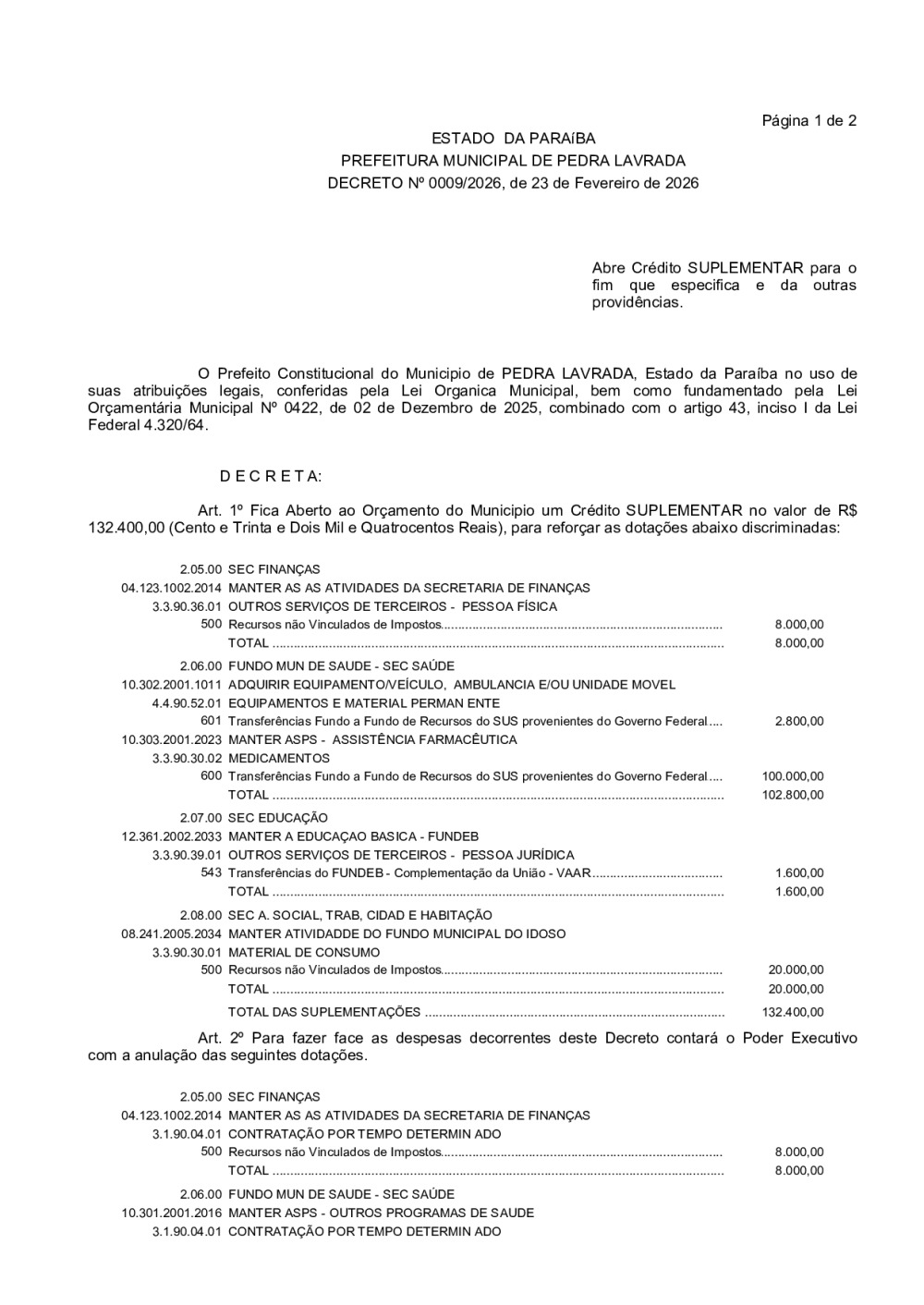 DECRETO Nº 0009/2026 - ABRE CRÉDITO SUPLEMENTAR PARA O FIM QUE ESPECIFICA