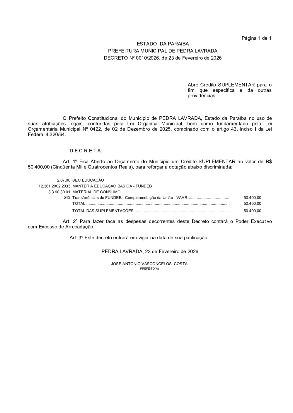 DECRETO Nº 0010/2026 - ABRE CRÉDITO SUPLEMENTAR PARA O FIM QUE ESPECIFICA