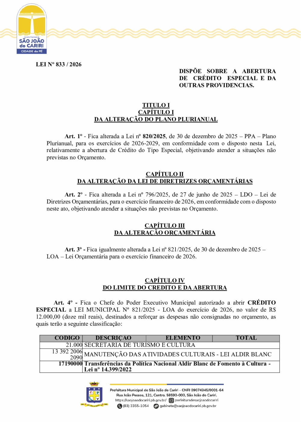 LEI Nº 833 / 2026 DISPÕE SOBRE A ABERTURA DE CRÉDITO ESPECIAL E DA OUTRAS PROVIDENCIAS.