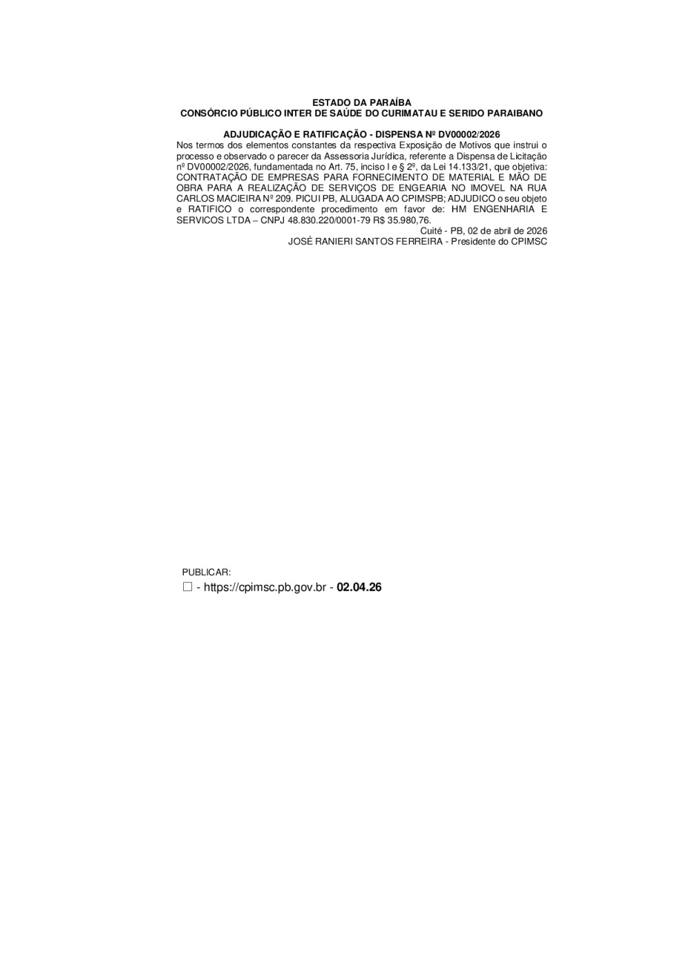 ADJUDICAÇÃO E RATIFICAÇÃO - DISPENSA Nº DV 0002/2026