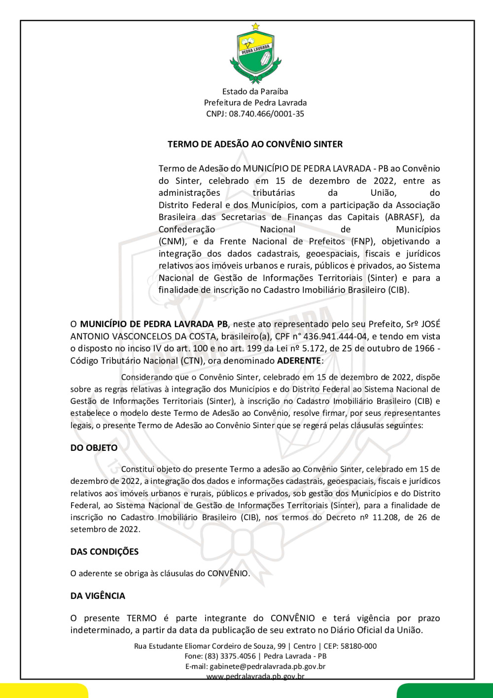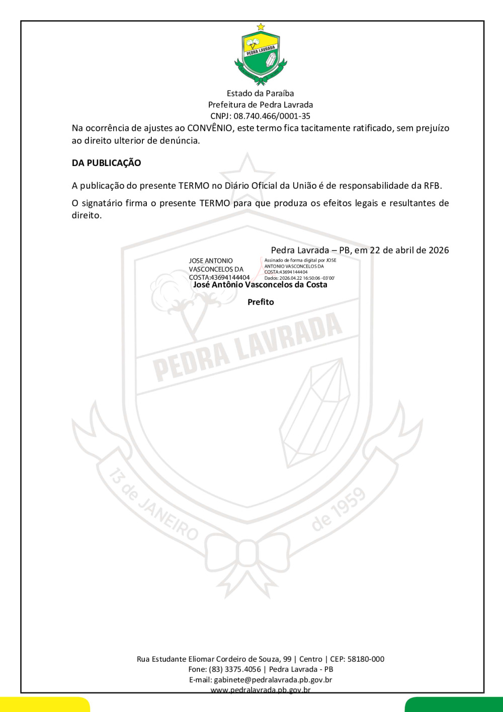 Conforme MP n° 2.200-2 de 24/08/2001, que institui a infraestrutura de chaves Públicas. Matéria Publicada no Diário Oficial do Município de Pedra Lavrada/PB no dia - Edição 02394.