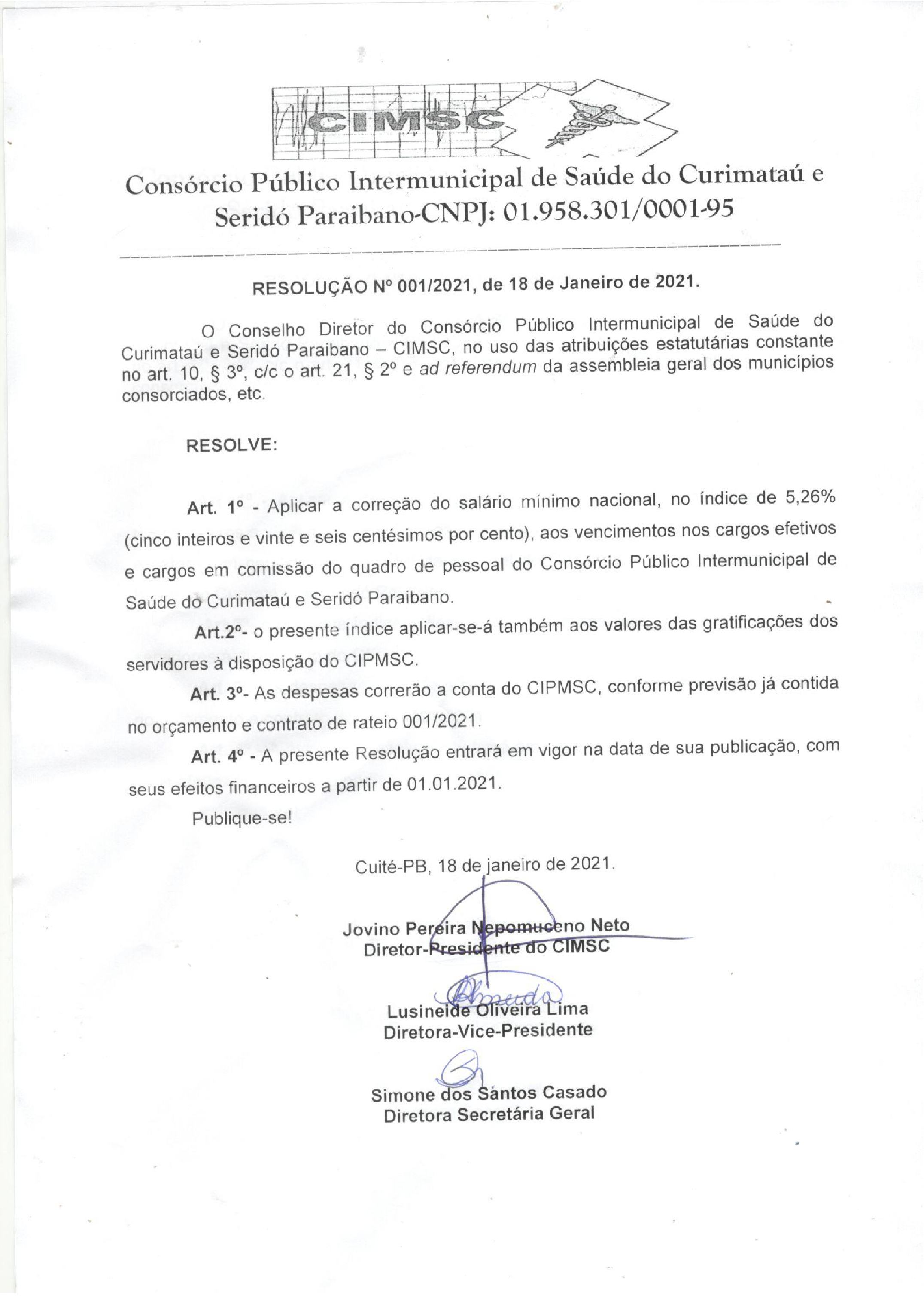 RESOLUÇÃO Nº 0001/2021 - 18 DE JANEIRO DE 2021
